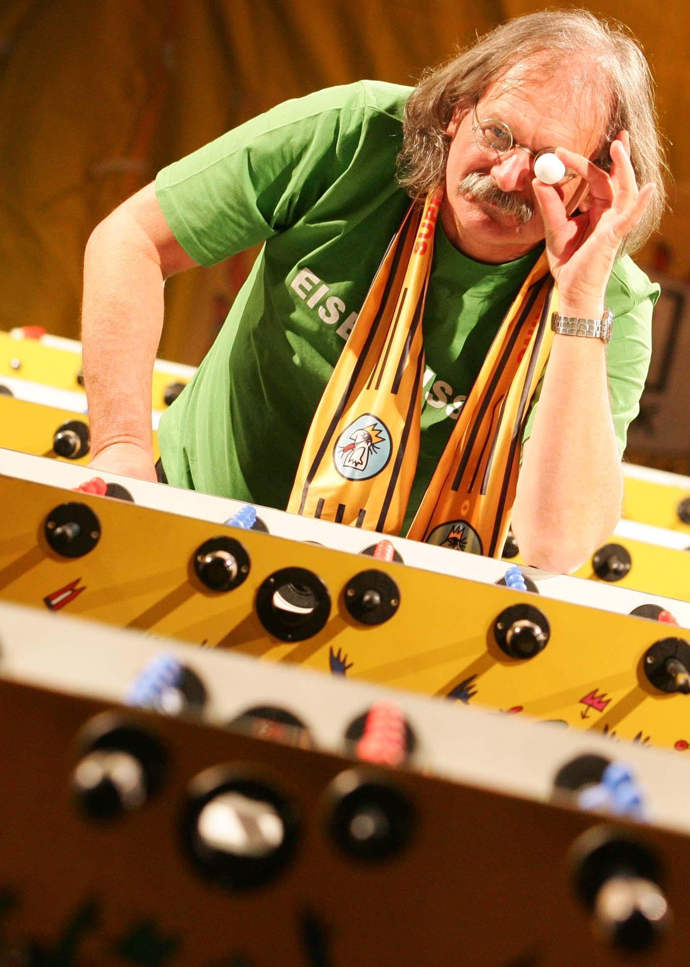 Unser Zappanale-Künstler #1 Helmut King begeistert sich bei weitem nicht nur für Zappa, sondern auch für Fußball. Das zeigt er in vielen seiner Werke, die er seit mehr als 20 Jahren zu diesem Thema geschaffen hat. Dazu gehören Bilder mit den Titeln „Welle“, „Elfer“ „Rote Karte“ oder „Volley“. Spiel und Spaß sind garantiert an Helmuts Tischfußball (Kicker), an dem er schon mit Napoleon Murphy Brock, Jimmy Carl Black und Arthur Brown spielte.